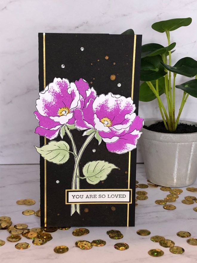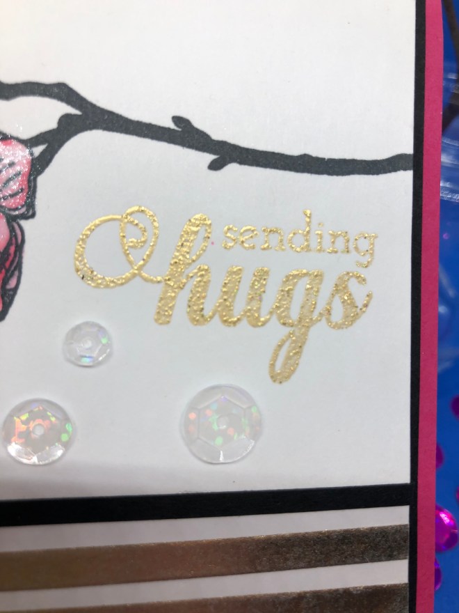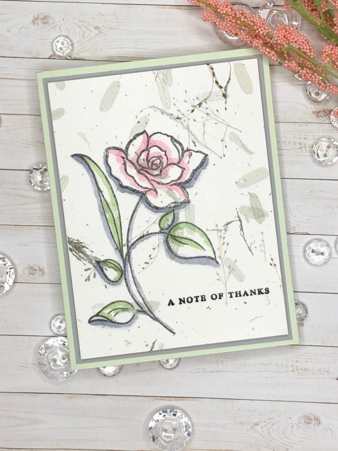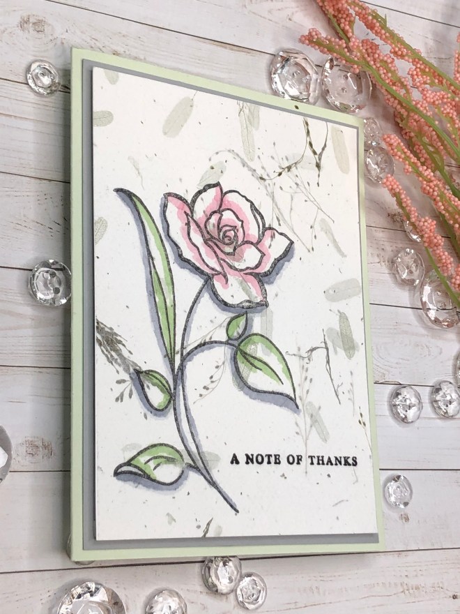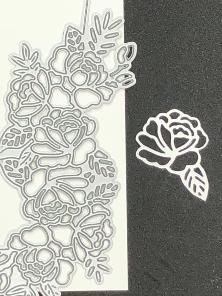 When I started the project I though I would use it as a border die as shown. After I filled the negative spaces I decided to fussy cut it out. I also cut 2 of the roses out of the die image to add to the card sentiment strip. Can you pick out the rose displayed in the die?