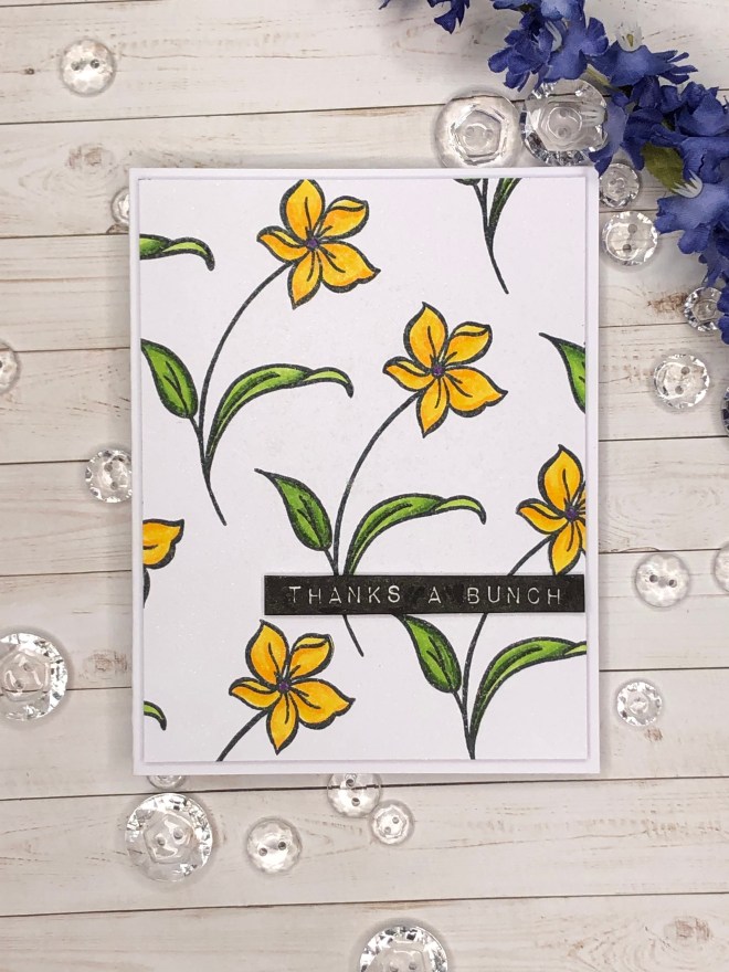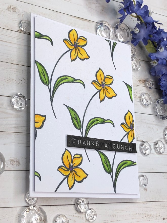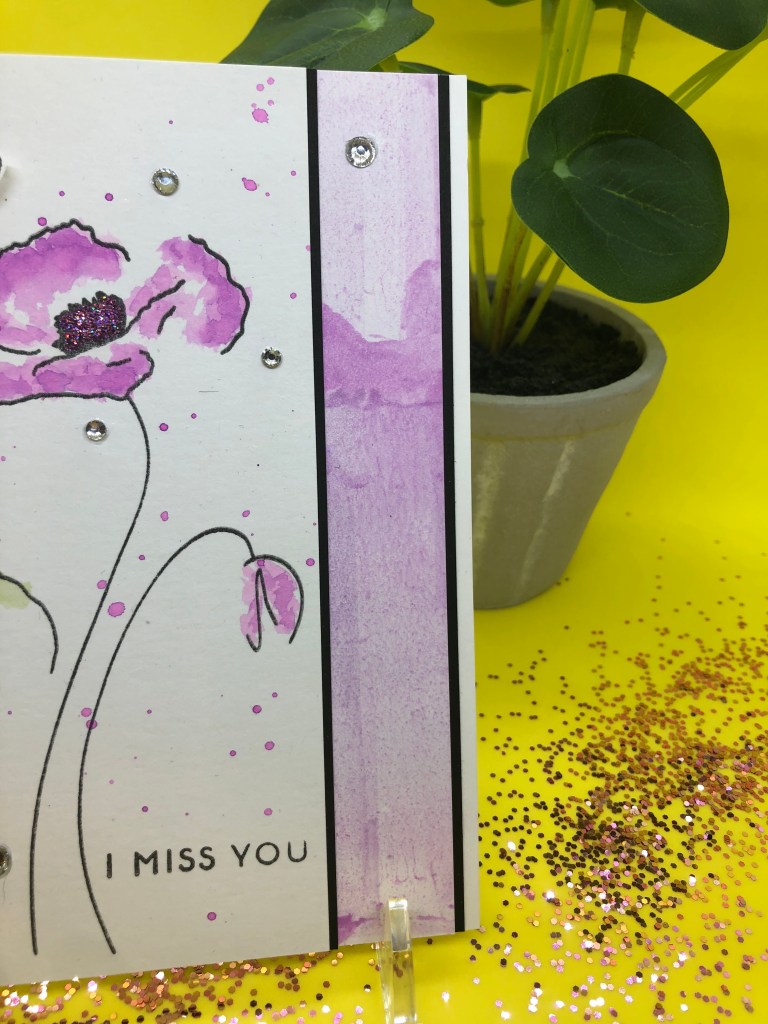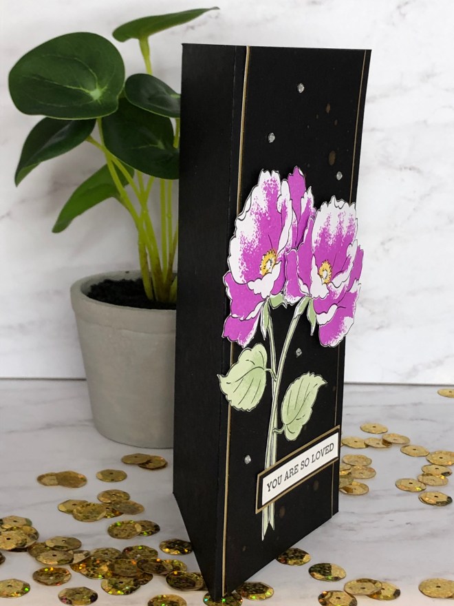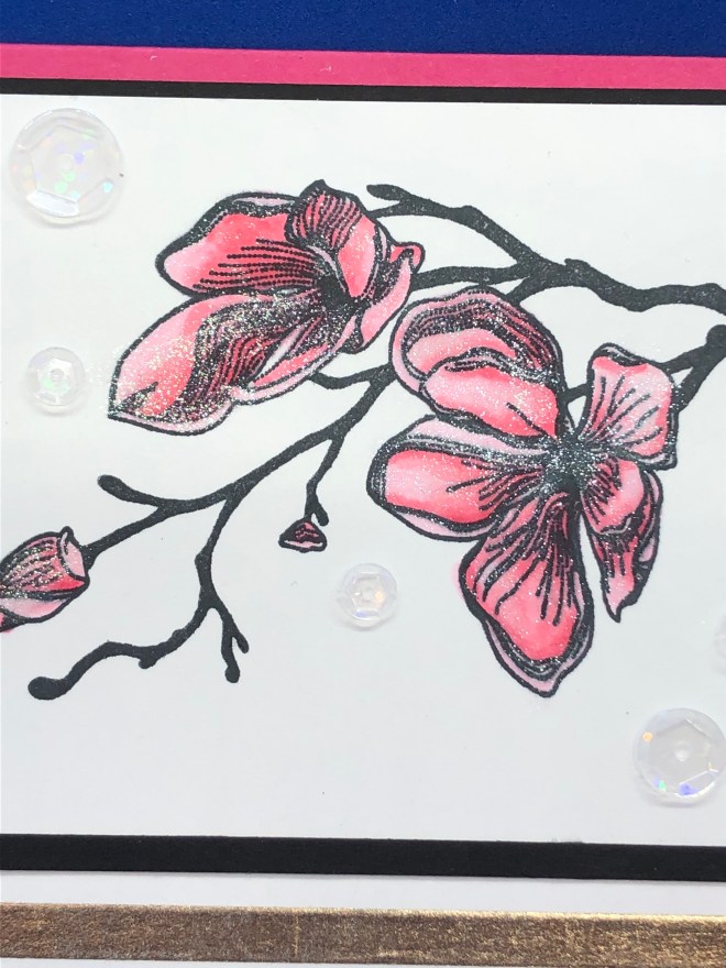 When I started the project I though I would use it as a border die as shown. After I filled the negative spaces I decided to fussy cut it out. I also cut 2 of the roses out of the die image to add to the card sentiment strip. Can you pick out the rose displayed in the die?