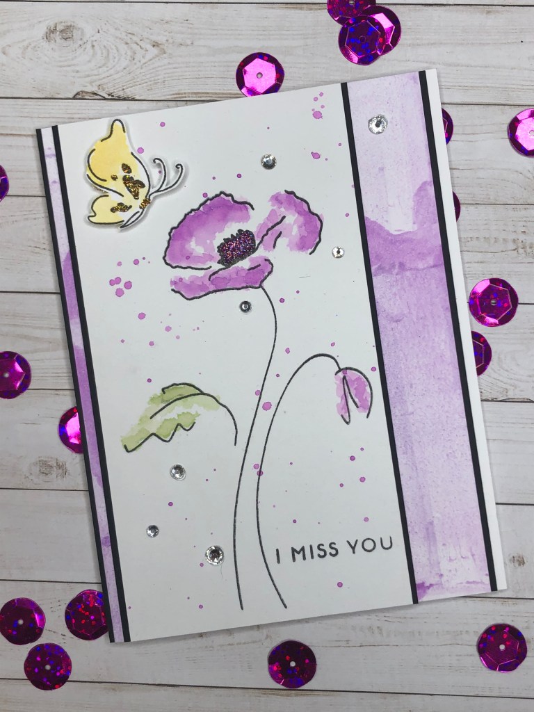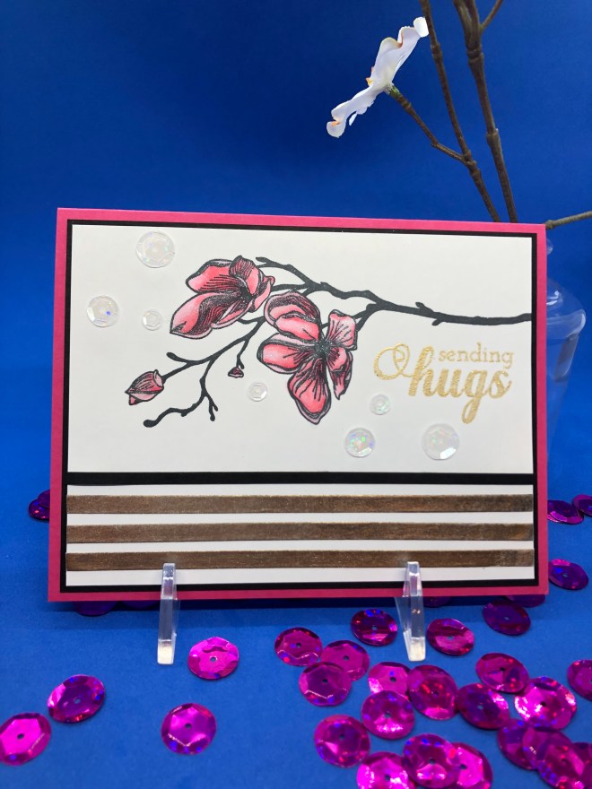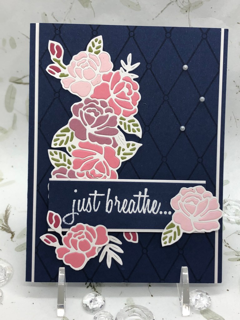I stamped the Stampin’Up! Night of Navy card stock with the Altenew “Pattern Play Diamond Stamp” stamp in Night of Nave ink to make the background for the card. I then adhered the die image to the card front by removing the backing of the adhesive sheet. The “Just Breathe…” image is embossed in white on a piece of the Night of Navy card stock and the 2 separate die and fussy cut roses are attached. The “Just Breathe…” sentiment and individual roses are raised with foam tape. Three pearl embellishments were attached in the right upper corner to complete the image. It is then attached to white card stock and the Night of Navy card base.