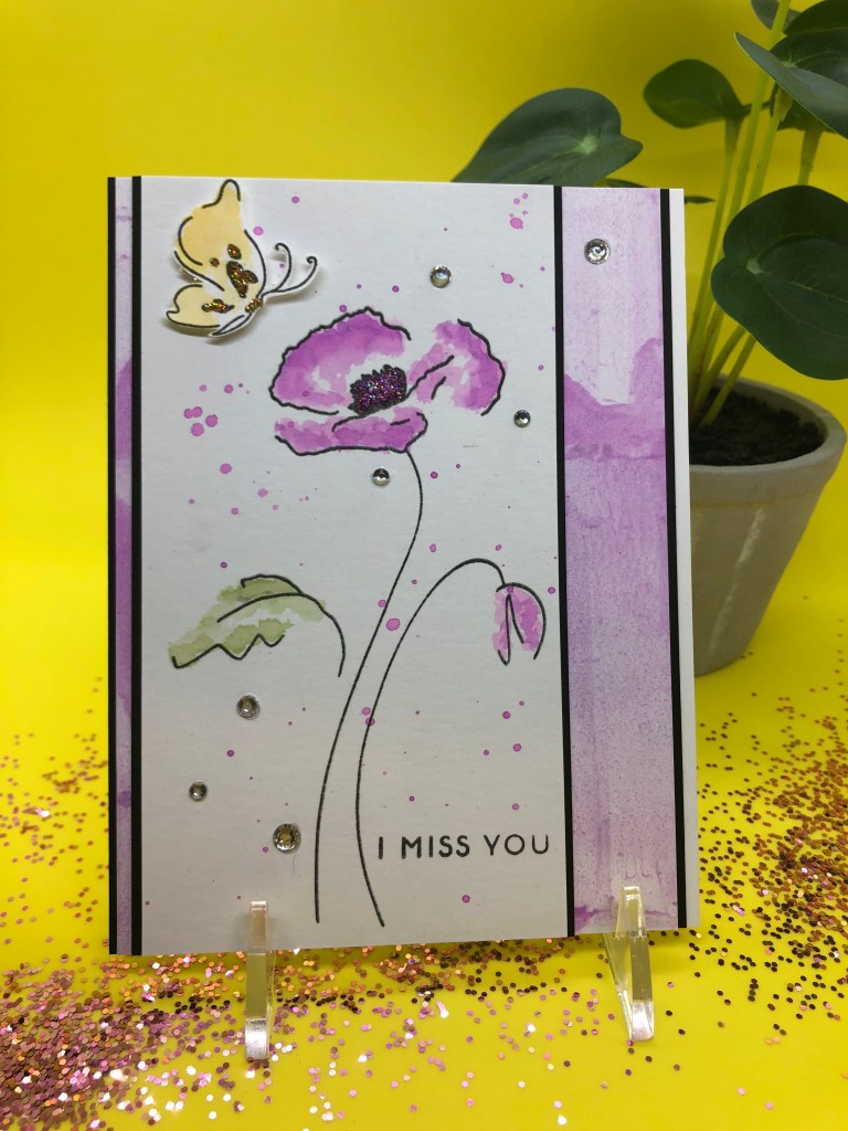 Altenew “Floral In ‘n’ Out Border Die”; Altenew “Bad Days Happen” stamp set; Altenew “Pattern Play Diamond Stamp” stamp set; white card stock; Stampin’Up! Night of Navy card stock and ink; Stampin’Up! card stock: Old Olive, Flirty Flamingo, Sweet Sugar Plum, Pink Pirouette, Rose Red; foam tape; pearl embellishments; Versamark Watermark Clear ink; white embossing powder; heat gun; transfer adhesive sheet.